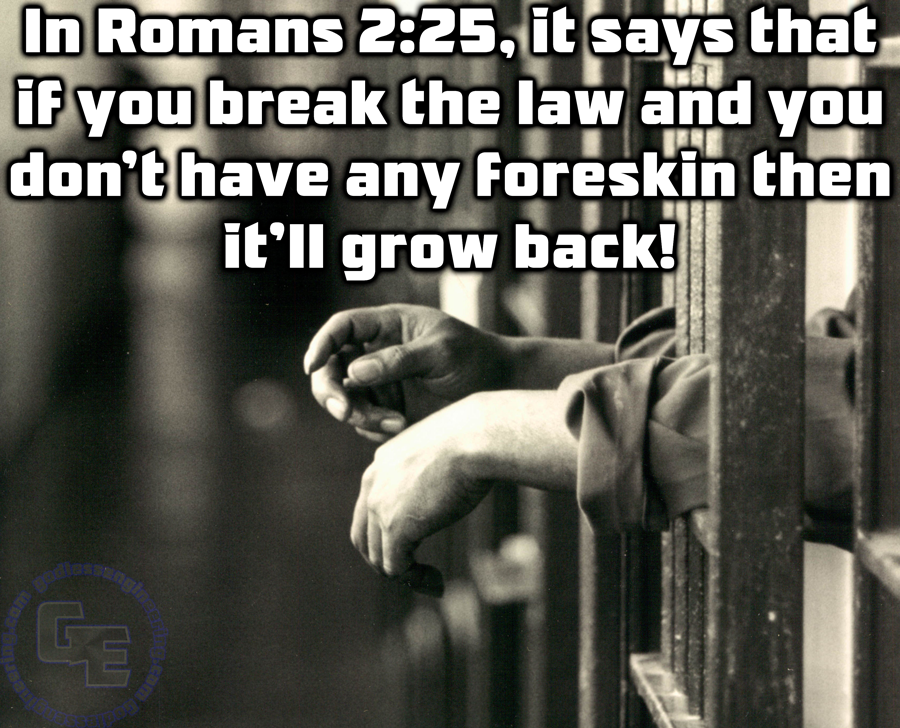 Bible literalists have not the benefit of interpretation. The bible literally says that if you are circumcised and break god’s law, then you will no longer be circumcised. Your foreskin will grow back. Unfortunately for Paul, there is no mention of this phenomenon in the medical literature.