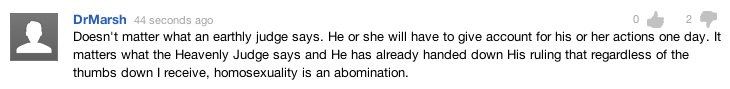 “DrMarsh” (I doubt he or she is a real doctor) gets one thing right; It doesn’t matter to him or her that a judge ruled an anti-gay marriage bill unconstitutional. But the point is that here we see another example of how the anti-LGBT group is comprised mostly of religious ideas.