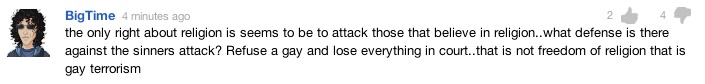 Well said. We are so close to defeating religious bigots in the name of human rights and freedom of speech and religion. The terrorism comment is an unacceptable extremist view that should be ridiculed. People of religion cannot dictate who is immoral and who is not. How dare they pledge allegiance to a god which convicts you of thought crime and dictates who you sleep with and in what way when he’s not condemning nations to genocide, famine and disease, among other atrocities. This is inhuman and we should not tolerate it. Claiming you speak for the make-believe man in the sky gives you no credibility when publicly talking about morality. We need to wake up to this and recognise the rights of all citizens, regardless of their sexuality, race and so on.