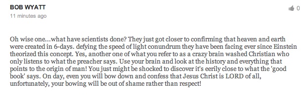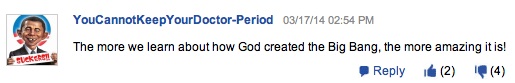 But furthermore, these findings do not in any way validate the Judeo-Christian religions. If anything, these findings cast more doubt over the book of Genesis. As I’ve mentioned before, Genesis is very specific about the universe: The earth is at its center. It is surrounded by a physical dome-shaped apparatus with holes in it (the stars) through which heavenly water falls to the earth as rain. Above that physical dome sits god and heaven. We have already proved this part of the bible wrong (hundreds of years ago). The Big Bang Theory provides us with an observable and testable methodology for determining how and when the universe actually began. This theory guts the creation story in the bible. Finding the “smoking gun” to support this theory essentially completely annihilates the hypotheses claimed in the book of Genesis. It does not support obviously useless biblical hypotheses, despite what the following Internet users believe.
