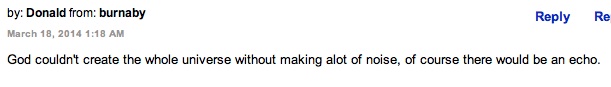 I was delighted by the news yesterday that the “smoking gun” in evidence for the Big Bang has been observed by cosmologists. After work I read through several news articles reporting the findings. Many of these articles allowed user comments, so I wandered down to the bottom of the page and began reading through many of them. What I observed was, needless to say, quite frustrating.