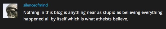 Atheist bloggers everywhere might be familiar with silenceofmind (SOM), a Christian apologist serial commenter who appears to believe to know more about what atheists believe (and don’t) than the atheists themselves. SOM uses non sequiturs, kettle logic, arguments from ignorance, red herrings, naturalistic fallacies, etc. etc. ad nauseum. To say that SOM’s comments are endearing, kind, or harmless is to miss the point SOM is trying to convey. Indeed, a fellow blogger, What comes to my mind…, had some pretty scathing words for SOM last month.
