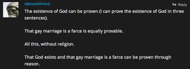 This one came from today. This comment shows an even stranger departure from SOM’s usual style. SOM claims to have proven without a doubt that god exists (using three sentences). But the first sentence (you have to be pretty liberal in your definitions to call it a sentence) is merely a claim that god is provable and gay marriage is bad. It doesn’t tell us anything. The second sentence isn’t even a sentence. I assume SOM means you don’t need religion to prove god exists and gay marriage is bad, but I could be wrong (since it’s not even a sentence!). Finally, SOM says reason alone will prove god and the evils of gay marriage. Again, this doesn’t tell us anything, let alone prove anything. I find it difficult to imagine that SOM really believes that claims count as proof. This is an extreme example of what we’ve seen from the usual apologetics.