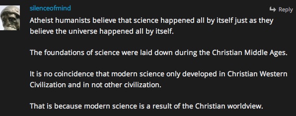 “Atheist humanists believe that science happened all by itself.” That is probably the most absurd claim I’ve ever heard. It’s one thing (albeit wrong) to say we believe the big bang happened all by itself, but that the actual scientific method just poofed into existence one day is one of the strangest beliefs I can imagine. I have little reason to believe that anyone, even a five-year-old, would make this claim about atheists.