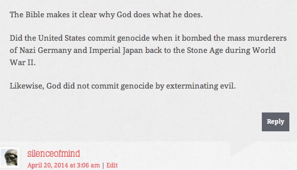 Let’s highlight the offending quote: “God did not commit genocide by exterminating evil.” To this, I finally replied in the usual manner; I called SOM out. This is found below:
