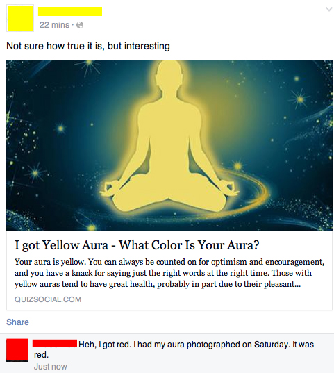 First, Yellow should know how true this is. It’s not true! Even if auras existed you wouldn’t be able to determine what color yours is based on an Internet questionnaire. But more importantly, no one who claims to be able to prove that auras exist have ever demonstrated that they do. The Amazing James Randi has offered them opportunity after opportunity (the $1,000,000 offer’s still on the table, by the way) to show under laboratory conditions that auras exist. Here’s a video from his television series where he debunks the aura myth: