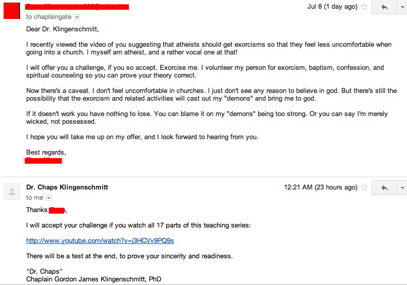 As some of you might remember from a post I made a week ago, Dr. “Chaps” Gordon Klingenschmitt recently said atheists should be exorcised so they’ll feel “free to enjoy the worship of Jesus Christ.” I retorted back with my post, saying, essentially, “Prove it. Exorcise me and see how I feel about Christianity afterwards.” After I made the post, I sent Dr. Chaps an email, basically saying the same thing. He replied that he’d take me up on my offer and exorcise me if I watched all 17 training videos he’s made on how to be a good Christian. I accepted his counter offer. Here’s the initial email I sent and his response: